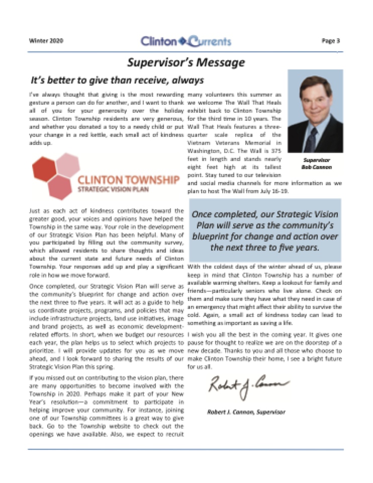 I wish you all the best in the coming year. It gives one pause for thought to realize we are on the doorstep of a new decade. Thanks to you and all those who choose to make Clinton Township their home, I see a bright future for us all.