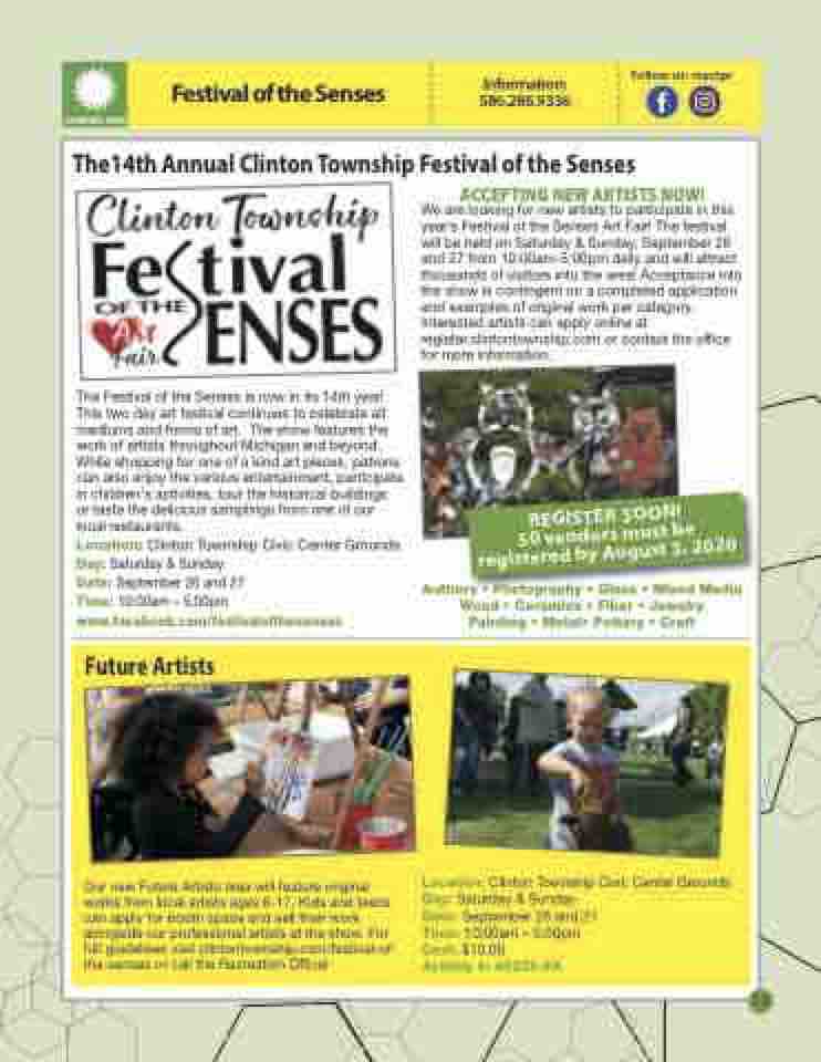 Our new Future Artists area will feature original works from local artists ages 6-17. Kids and teens can apply for booth space and sell their work alongside our professional artists at the show. For full guidelines visit clintontownship.com/festival-of- the-senses or call the Recreation Office!