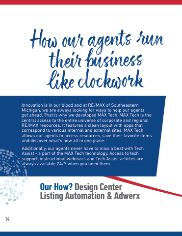 Innovation is in our blood and at RE/MAX of Southeastern Michigan, we are always looking for ways to help our agents get ahead. That is why we developed MAX Tech. MAX Tech is the central access to the entire universe of corporate and regional RE/MAX resources. It features a clean layout with apps that correspond to various internal and external sites. MAX Tech allows our agents to access resources, save their favorite items and discover what's new all in one place.