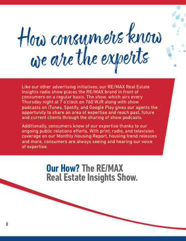 Like our other advertising initiatives, our RE/MAX Real Estate Insights radio show places the RE/MAX brand in front of consumers on a regular basis. The show, which airs every Thursday night at 7 o’clock on 760 WJR along with show podcasts on iTunes, Spotify, and Google Play gives our agents the opportunity to share an area of expertise and reach past, future and current clients through the sharing of show podcasts.