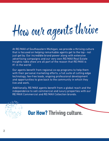 At RE/MAX of Southeastern Michigan, we provide a thriving culture that is focused on helping remarkable agents get to the top - not just get by. Our incredible brand power along with extensive advertising campaigns and our very own RE/MAX Real Estate Insights radio show are all part of the reason that RE/MAX is