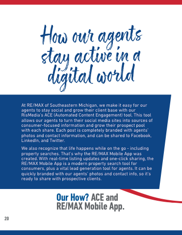 At RE/MAX of Southeastern Michigan, we make it easy for our agents to stay social and grow their client base with our RisMedia's ACE (Automated Content Engagement) tool. This tool allows our agents to turn their social media sites into sources of consumer-focused information and grow their prospect pool with each share. Each post is completely branded with agents’ photos and contact information, and can be shared to Facebook, LinkedIn, and Twitter.