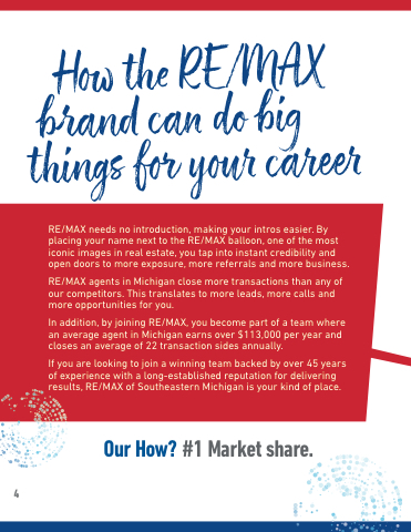 In addition, by joining RE/MAX, you become part of a team where an average agent in Michigan earns over $113,000 per year and closes an average of 22 transaction sides annually.