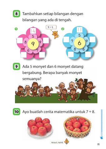 8 Tambahkan setiap bilangan dengan 8 bilangan yang ada di tengah. ➊ 9+5 ➋ 9 Ada 5 monyet dan 6 monyet datang 9 bergabung. Berapa banyak monyet semuanya? Ayo buatlah cerita matematika untuk 7+8. 10 10 Aktifitas Kelas1, Hal 45 95