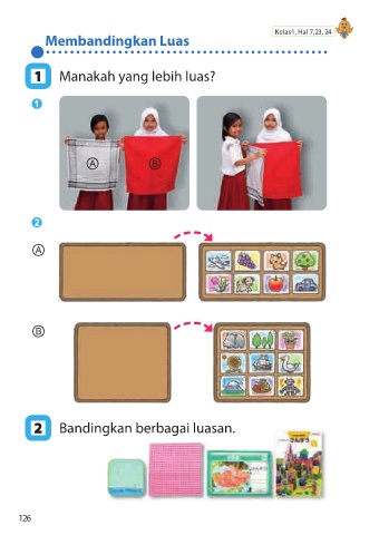 Membandingkan Luas Kelas1, Hal 7,23, 24 1 1 Manakah yang lebih luas? ➊ Ⓐ Ⓑ ➋ Ⓐ Ⓑ 2 2 Bandingkan berbagai luasan. 126