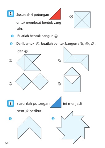 2 Susunlah 4 potongan Ⓐ untuk membuat bentuk yang lain. ➊ Buatlah bentuk bangun Ⓐ. ➋ Dari bentuk Ⓐ, buatlah bentuk bangun : Ⓑ, Ⓒ, Ⓓ, dan Ⓔ. Ⓑ Ⓒ Ⓓ Ⓔ 3 Susunlah potongan ini menjadi bentuk berikut. ➊ ➋ 142