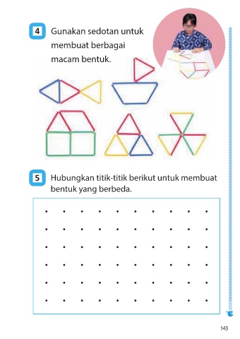 4 Gunakan sedotan untuk membuat berbagai macam bentuk. 5 Hubungkan titik-titik berikut untuk membuat bentuk yang berbeda. Aktifitas 143