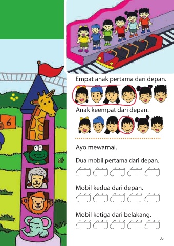 Empat anak pertama dari depan. Anak keempat dari depan. Ayo mewarnai. Dua mobil pertama dari depan. Mobil kedua dari depan. Mobil ketiga dari belakang. 33