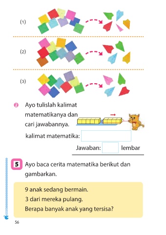 ⑴ ⑵ ⑶ ➋ Ayo tulislah kalimat matematikanya dan cari jawabannya. kalimat matematika: Jawaban: lembar 5 Ayo baca cerita matematika berikut dan 5 gambarkan. 9 anak sedang bermain. 3 dari mereka pulang. Berapa banyak anak yang tersisa? Aktifitas 56