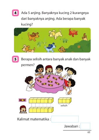 4 4 Ada 5 anjing. Banyaknya kucing 2 kurangnya dari banyaknya anjing. Ada berapa banyak kucing? 5 5 Berapa selisih antara banyak anak dan banyak permen? selisih Kalimat matematika : Jawaban : 63