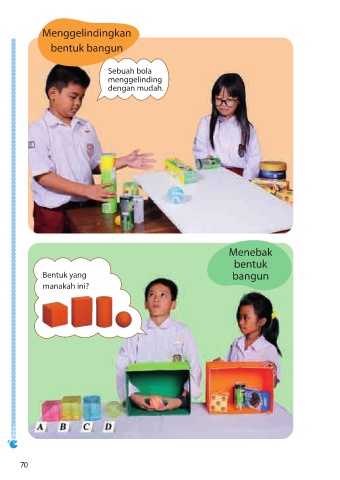 Menggelindingkan bentuk bangun Sebuah bola menggelinding dengan mudah. Menebak bentuk Bentuk yang bangun manakah ini? Aktifitas 70