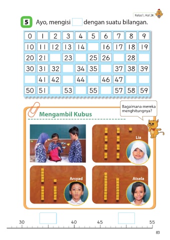 Kelas1, Hal 24 5 5 Ayo, mengisi dengan suatu bilangan. Bagaimana mereka Mengambil Kubus menghitungnya? Lia Arsyad Atsela 83