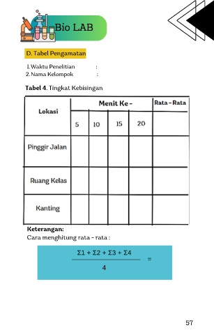 Bio LAB D. Tabel Pengamatan 1. Waktu Penelitian : 2. Nama Kelompok : Tabel 4. Tingkat Kebisingan Keterangan: Cara menghitung rata - rata : Σ1 + Σ2 + Σ3 + Σ4 = 4 57