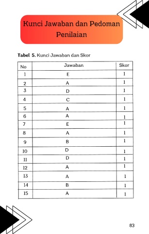 Kunci Jawaban dan Pedoman Penilaian Tabel 5. Kunci Jawaban dan Skor No Jawaban Skor 1 E 1 2 A 1 3 D 1 4 C 1 5 A 1 6 A 1 7 E 1 8 A 1 9 B 1 10 D 1 D 11 1 12 A 1 13 A 1 14 B 1 15 A 1 83