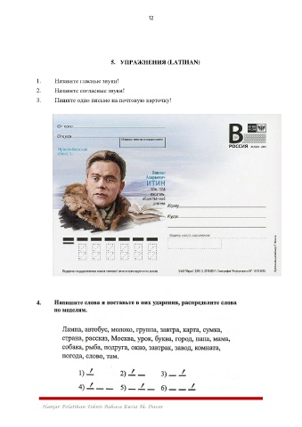 12 5. УПРАЖНЕНИЯ (LATIHAN) 1. Назавите гласные звуки! 2. Назавите согласные звуки! 3. Пишите одно письмо на почтовую карточку! 4. Hanjar Pelatihan Teknis Bahasa Rusia Tk. Dasar