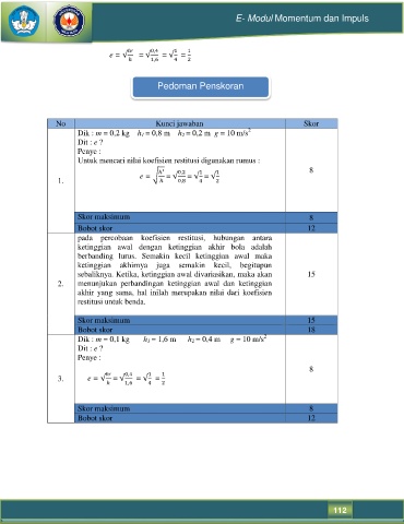Untuk mencari nilai koefisien restitusi digunakan rumus :