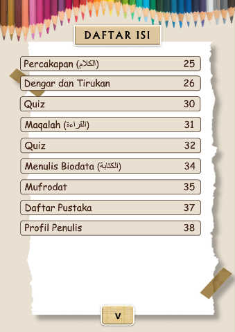 DAFTAR ISI Percakapan ملاكلا ( 25 ) Dengar dan Tirukan 26 Quiz 30 Maqalah ةءارقلا ( 31 ) Quiz 32 Menulis Biodata ةباتكلا ( 34 ) Mufrodat 35 Daftar Pustaka 37 Profil Penulis 38 v