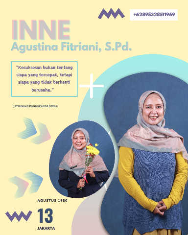 +62895328511969 INNE INNE Agustina Fitriani, S.Pd. Agustina Fitriani, S.Pd. "Kesuksesan bukan tentang siapa yang tercepat, tetapi siapa yang tidak berhenti berusaha.” Jatibening Pondok Gede Bekasi A G U S T U S 1 9 8 0 13 JAKARTA