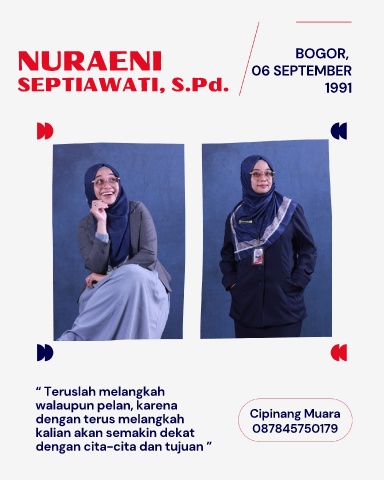 NURAENI 06 SEPTEMBER U I R E A N N BOGOR, S E P T I A W A T I , S . P d . 1991 SEPTIAWATI, S.Pd. “ Teruslah melangkah walaupun pelan, karena dengan terus melangkah Cipinang Muara kalian akan semakin dekat 087845750179 dengan cita-cita dan tujuan ”