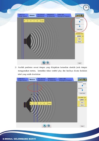 36 2) Aturlah pembatas sesuai dengan yang diinginkan kemudian ukurlah jarak dengan menggunakan metera, kemudian tekan tombol play dan hasilnya dicatat kedalam tabel yang sudah disediakan A B E-MODUL GELOMBANG BUNYI