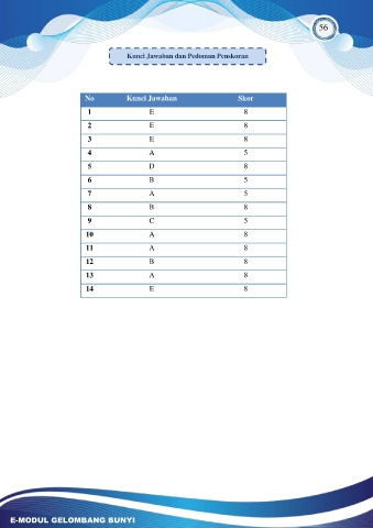 56 Kunci Jawaban dan Pedoman Penskoran No Kunci Jawaban Skor 1 E 8 2 E 8 3 E 8 4 A 5 5 D 8 6 B 5 7 A 5 8 B 8 9 C 5 10 A 8 11 A 8 12 B 8 13 A 8 14 E 8 E-MODUL GELOMBANG BUNYI
