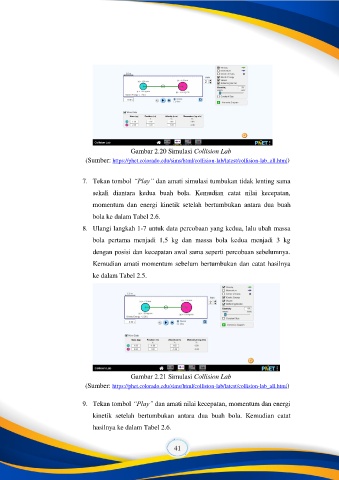 7. Tekan tombol “Play” dan amati simulasi tumbukan tidak lenting sama