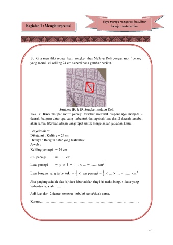Jika Bu Rina melipat motif persegi tersebut menurut diagonalnya menjadi 2