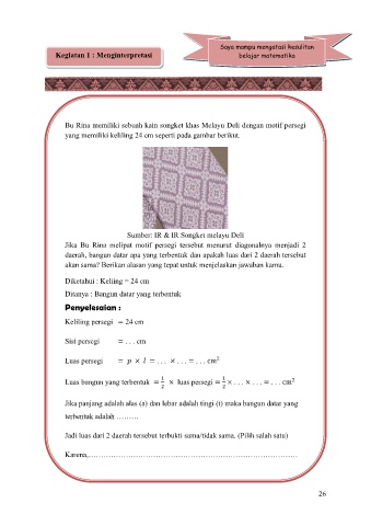 Jika Bu Rina melipat motif persegi tersebut menurut diagonalnya menjadi 2