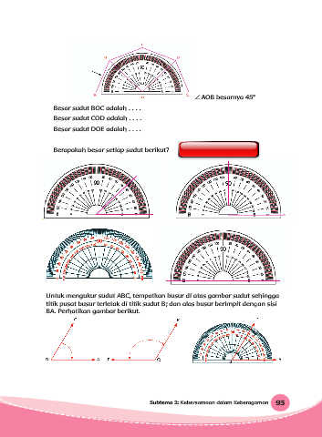 Untuk mengukur sudut ABC, tempatkan busur di atas gambar sudut sehingga