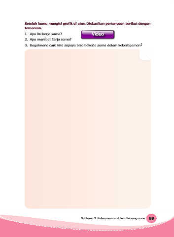 Setelah kamu mengisi grafik di atas, Diskusikan pertanyaan berikut dengan temanmu. 1. Apa itu kerja sama? 2. Apa manfaat kerja sama? 3. Bagaimana cara kita supaya bisa bekerja sama dalam keberagaman? Subtema 2: Kebersamaan dalam Keberagaman 89