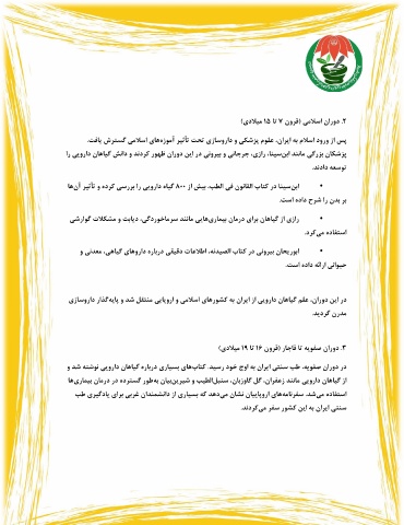 در این دوران ،علم گیاهان دارویی از ایران به کشورهای اسلامی و اروپایی منتقل شد و پایهگذار داروسازی