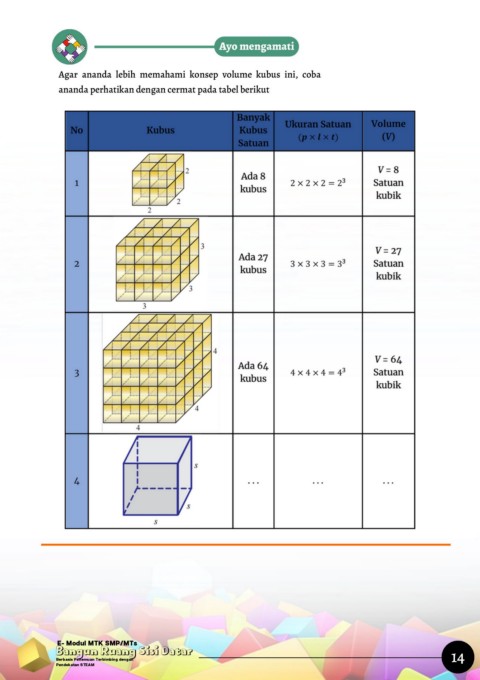 Ayo mengamati Agar ananda lebih memahami konsep volume kubus ini, coba ananda perhatikan dengan cermat pada tabel berikut E- Modul MTK SMP/MTs Bangun Ruang Sisi Datar 14 Berbasis Penemuan Terbimbing dengan Pendekatan STEAM