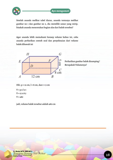 jadi, volume balok tersebut adalah 480 cm