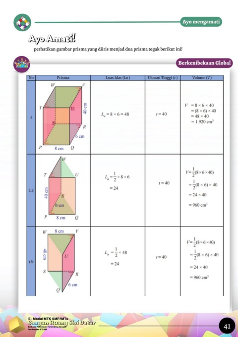 Ayo mengamati Ayo Amati! perhatikan gambar prisma yang diiris menjad dua prisma tegak berikut ini! Berkenibekaan Global E- Modul MTK SMP/MTs Bangun Ruang Sisi Datar Berbasis Penemuan Terbimbing dengan 41 Pendekatan STEAM
