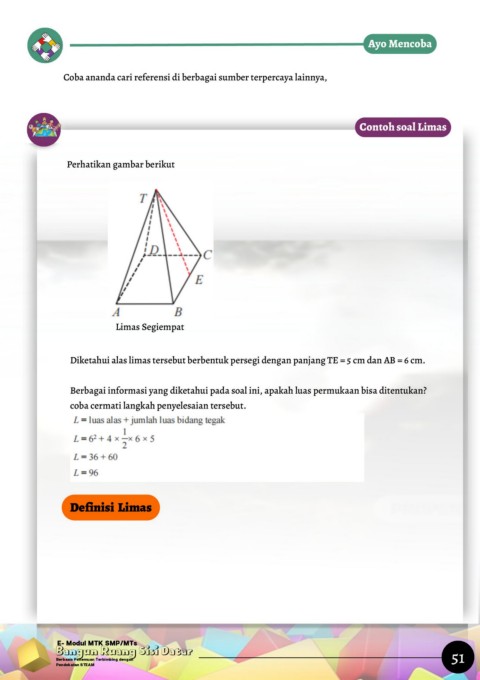 Diketahui alas limas tersebut berbentuk persegi dengan panjang TE = 5 cm dan AB = 6 cm.