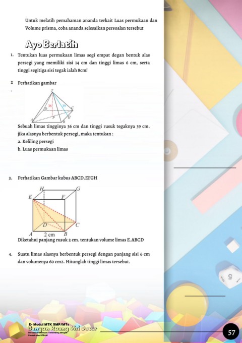 4. Suatu limas alasnya berbentuk persegi dengan panjang sisi 6 cm