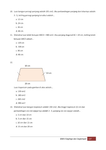 10. Luas bangun persegi panjang adalah 135 cm2. Jika perbandingan panjang dan lebarnya adalah