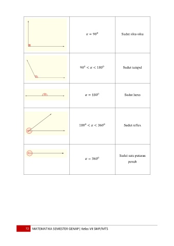 0 = 90 Sudut siku-siku 0 90 < < 180 Sudut tumpul 0 0 = 180 Sudut lurus 0 0 180 < < 360 Sudut reflex Sudut satu putaran 0 = 360 penuh 72 MATEMATIKA SEMESTER GENAP| Kelas VII SMP/MTS