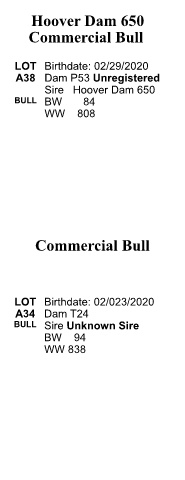 Hoover Dam 650 Commercial Bull LOT Birthdate: 02/29/2020 A38 Dam P53 Unregistered Sire Hoover Dam 650 BULL BW 84 WW 808 Commercial Bull LOT Birthdate: 02/023/2020 A34 Dam T24 BULL Sire Unknown Sire BW 94 WW 838