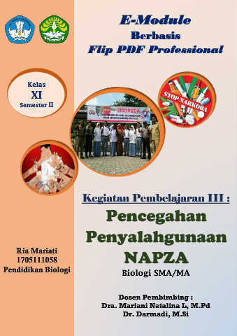 E-Module Berbasis Flip PDF Professional Kelas XI Semester II Kegiatan Pembelajaran III : Pencegahan Penyalahgunaan Ria Mariati NAPZA 1705111058 Pendidikan Biologi Biologi SMA/MA Dosen Pembimbing : Dra. Mariani Natalina L, M.Pd Dr. Darmadi, M.Si