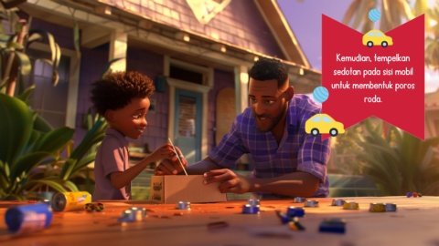 Kemudian, tempelkan sedotan pada sisi mobil untuk membentuk poros roda.