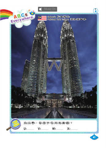 CD 2 4 ABCs Malaysia 馬來西亞 29 Ever y where Petronas Twin Towers 國油雙峰塔 W W U W W X X V V Look 找找看,每個字母共有幾個? and Count U: V: W: X: 41