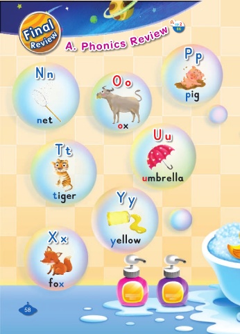 Final A. Phonics Review CD 2 66 Review Pp Nn Oo pig net ox Uu Tt umbrella tiger Yy Xx yellow fox 58