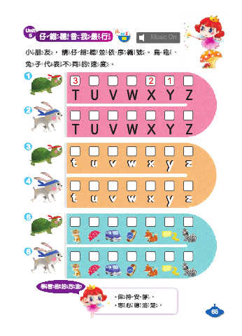 Unit 5 仔細聽音我最行 CD 2 69 小朋友,請仔細聽並依序編號。烏龜、 兔子代表不同的速度。 1 3 2 T U V W X Y Z 2 T U V W X Y Z 3 t u v w x y z 4 t u v w x y z 5 我和 一起上臺表演,我的勇氣指數是 。 6 學習的好方法 保持安靜。 ● ● 專心聽清楚。 65