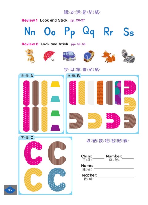 課本活動貼紙 Review 1 Look and Stick pp. 26-27 Nn Oo Pp Qq Rr Ss Review 2 Look and Stick pp. 54-55 字母筆畫貼紙 字母 A 字母 B 字母 C 收納袋姓名貼紙 Class: Number: 班級 座 號 Name: 姓名 Teacher: 教 師 95