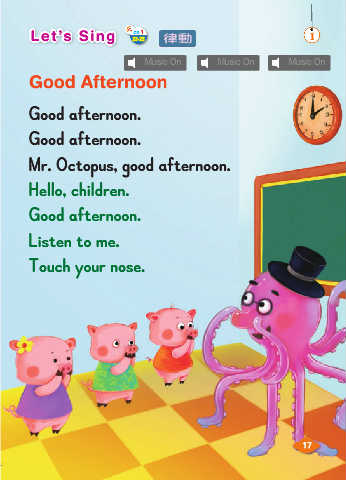 CD 1 Let’s Sing 23-25 1 Good Afternoon Good afternoon. Good afternoon. Mr. Octopus, good afternoon. Hello, children. Good afternoon. Listen to me. Touch your nose. 16 17