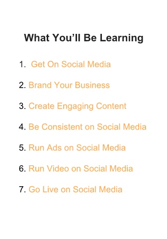 What You’ll Be Learning 1. Get On Social Media 2. Brand Your Business 3. Create Engaging Content 4. Be Consistent on Social Media 5. Run Ads on Social Media 6. Run Video on Social Media 7. Go Live on Social Media