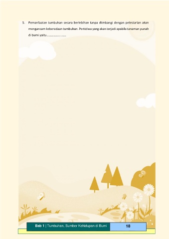 5. Pemanfaatan tumbuhan secara berlebihan tanpa diimbangi dengan pelestarian akan mengancam keberadaan tumbuhan. Peristiwa yang akan terjadi apabila tanaman punah di bumi yaitu……………………. Bab 1 | Tumbuhan, Sumber Kehidupan di Bumi 18