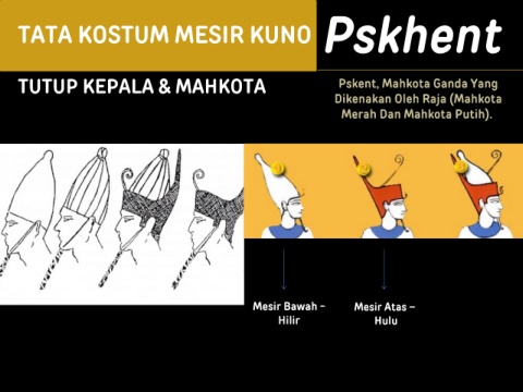 TATA KOSTUM MESIR KUNO Pskhent TUTUP KEPALA & MAHKOTA Pskent, Mahkota Ganda Yang Dikenakan Oleh Raja (Mahkota Merah Dan Mahkota Putih). Mesir Bawah - Mesir Atas – Hilir Hulu