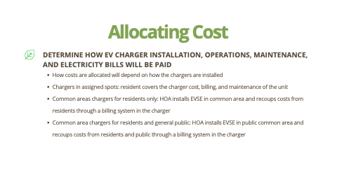 Chargers in assigned spots: resident covers the charger cost, billing, and maintenance of the unit Common areas chargers for residents only: HOA installs EVSE in common area and recoups costs from residents through a billing system in the charger